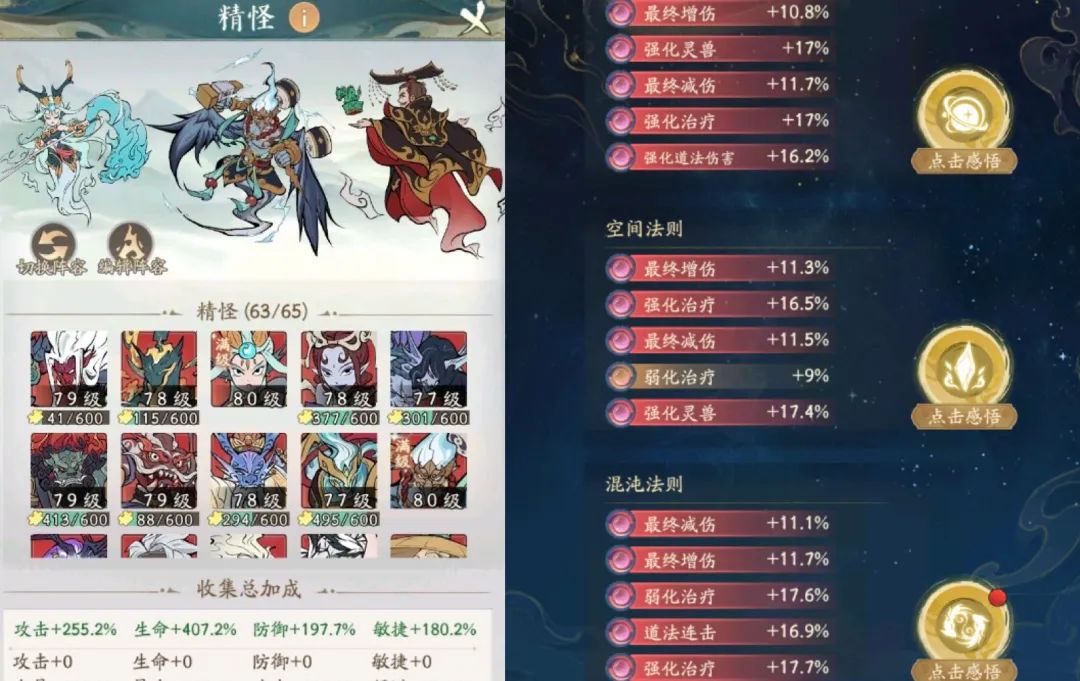 2️⃣ 精怪与法则:这个精怪和法则每看一次,都非常吃惊。这才不到6个月啊,红色精怪大多都80级了!这比当初的流年都恐怖,法则也是几乎全红毕业!