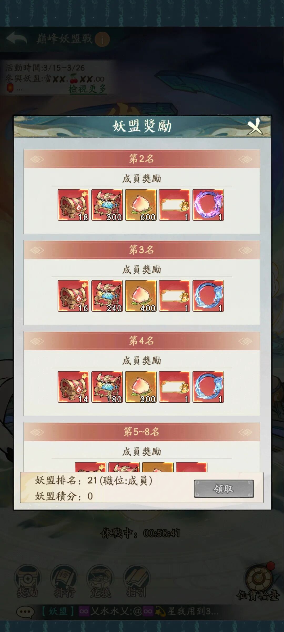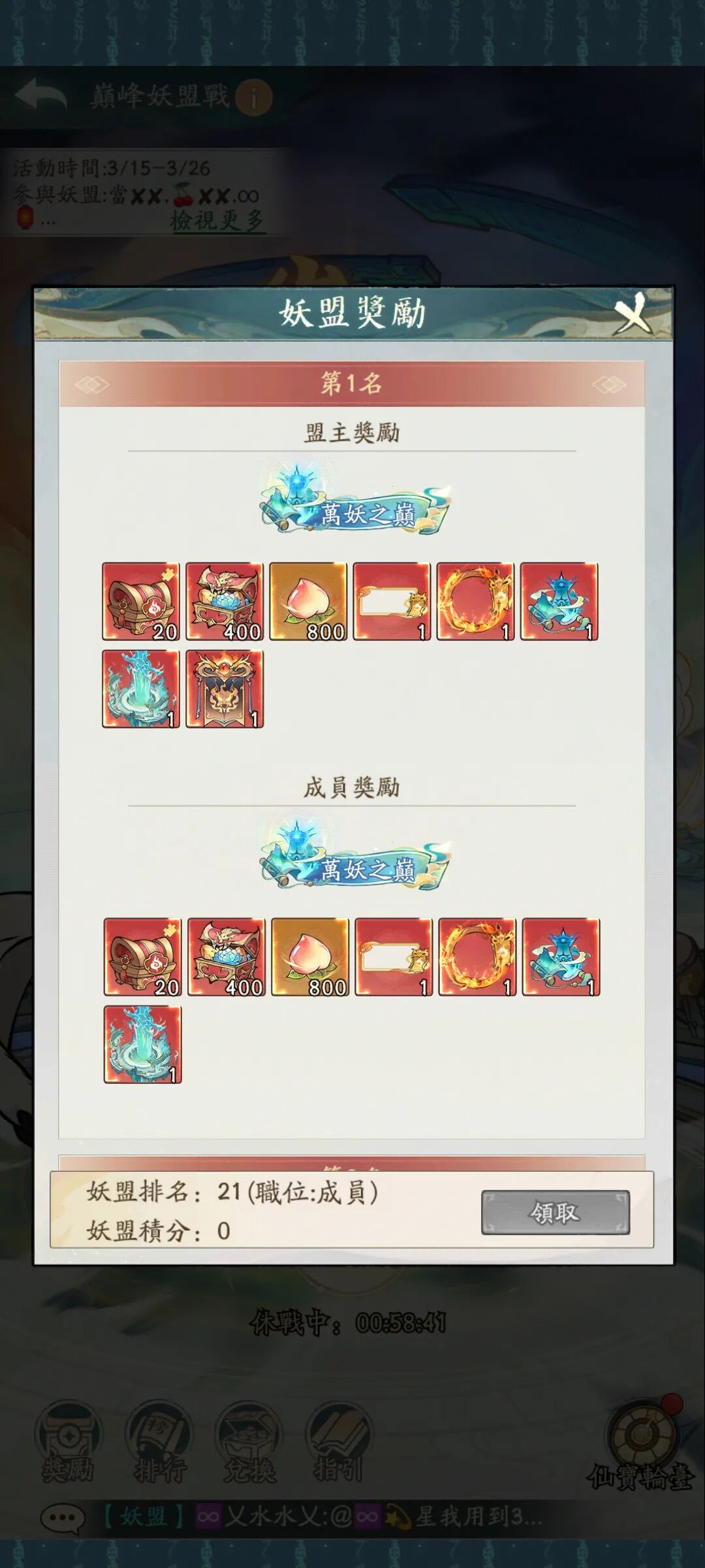 2. 领奖期间,根据妖盟排名领取对应的排名奖励。
