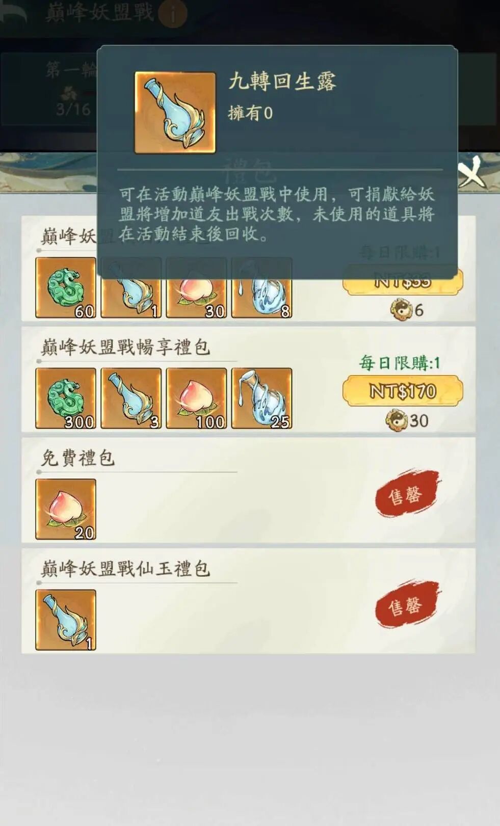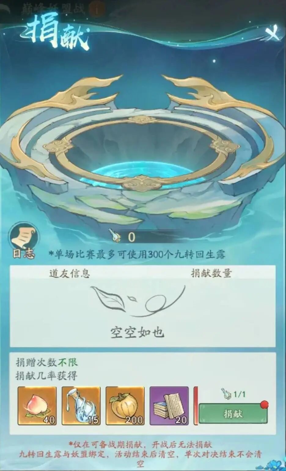 1. 备战期:妖盟成员可捐献【九转回生露】,同时获得捐献奖励。