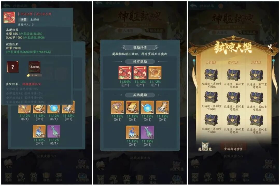 7️⃣神躯试炼:新增神话法宝获取,造化量天秤(攻击,抗破甲,攻击,羁绊增伤),试炼大奖有几率开出碎片。