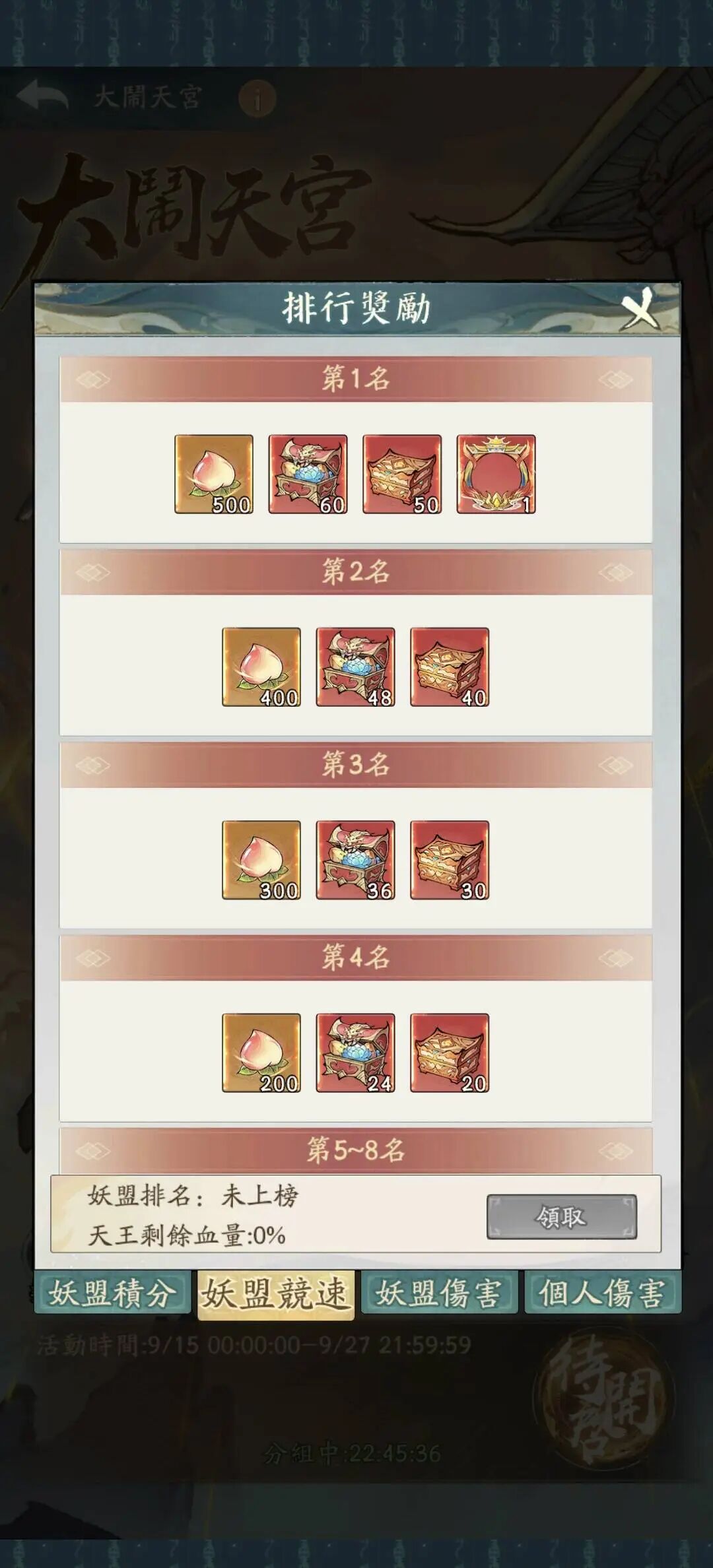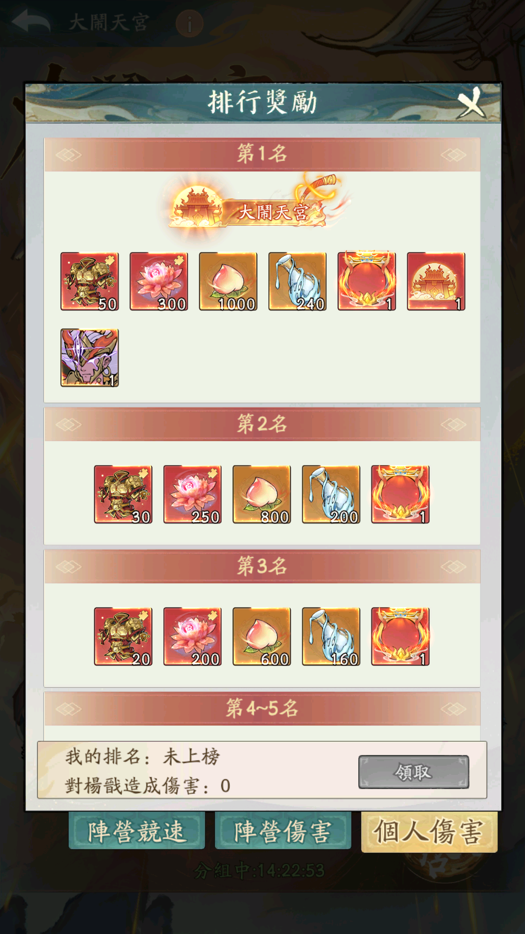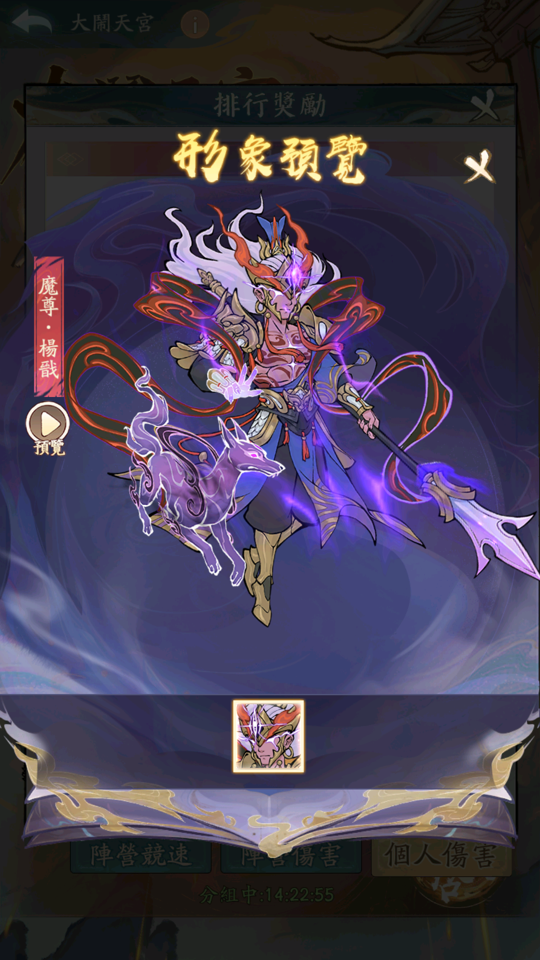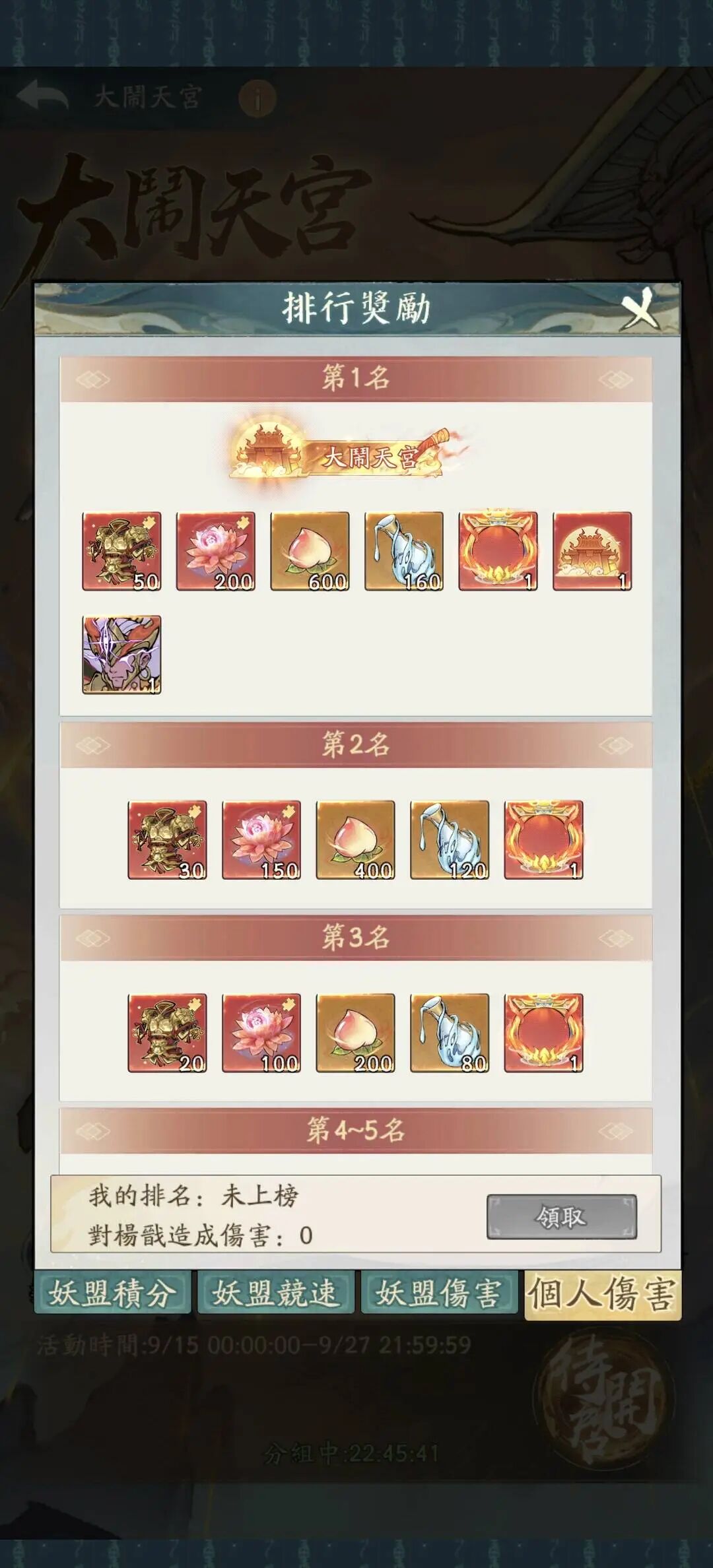 🎮仙妖大战结束:仙妖大战结束后,将根据对杨戬造成的阵营伤害,个人伤害进行排名,领取对应的排名奖励。