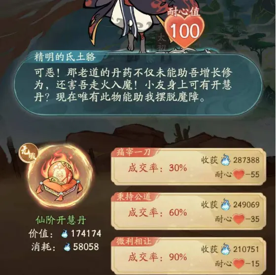 耐心类:耐心类的虽然不花钱可以随便消耗,但是失败了依然有损失! 一般情况:选择2、2、3! 精明的:精明的不好糊弄,直接选3 贫穷的:可以当冤大头,选1、2、3 急切的:可以试试宰一笔,选1、2、3