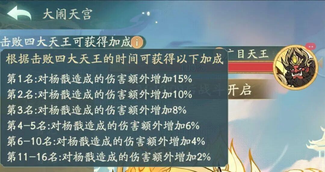 🎮四大天王开启后各个妖盟的击败速度决定后续对杨戬的伤害加成。