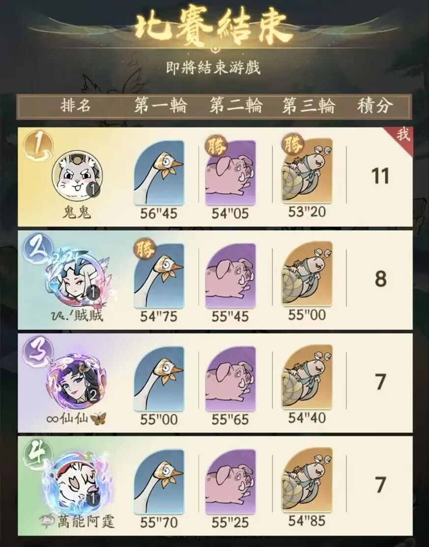 2.三回合总得分最高者获胜;总分相同则比较总用时,用时少者排名高