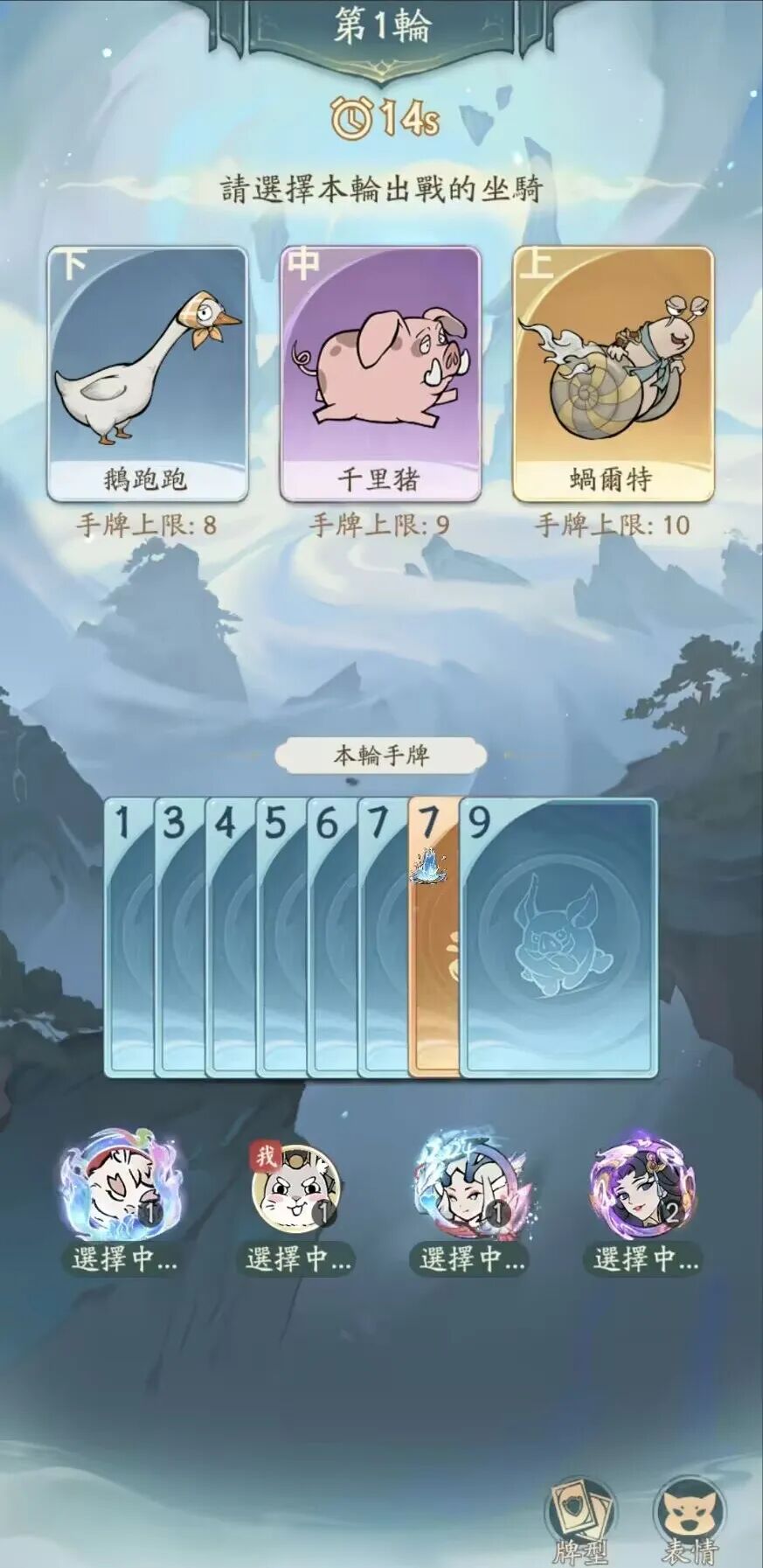 每回合开始前,所有玩家同时选择座驾(上等/中等/下等),倒计时结束即进入比赛阶段