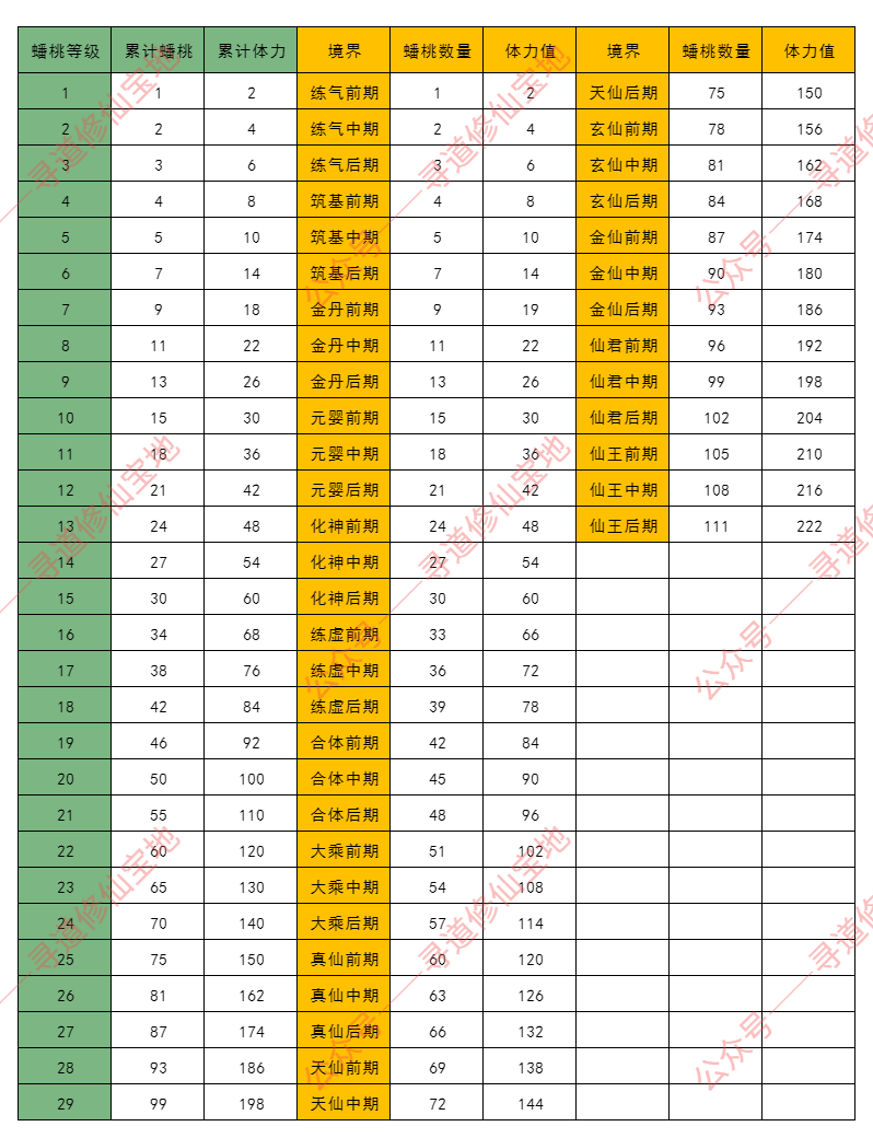 854w炼虚前期,1100w炼虚中期,1845w炼虚后期,3400w合体中期,5300w合体中期,8000w大乘前期,1.16亿大乘中期,1.74亿大乘后期,2.85亿真仙前期,5.58亿真仙中期,9亿真仙后期,10.94亿天仙前期,