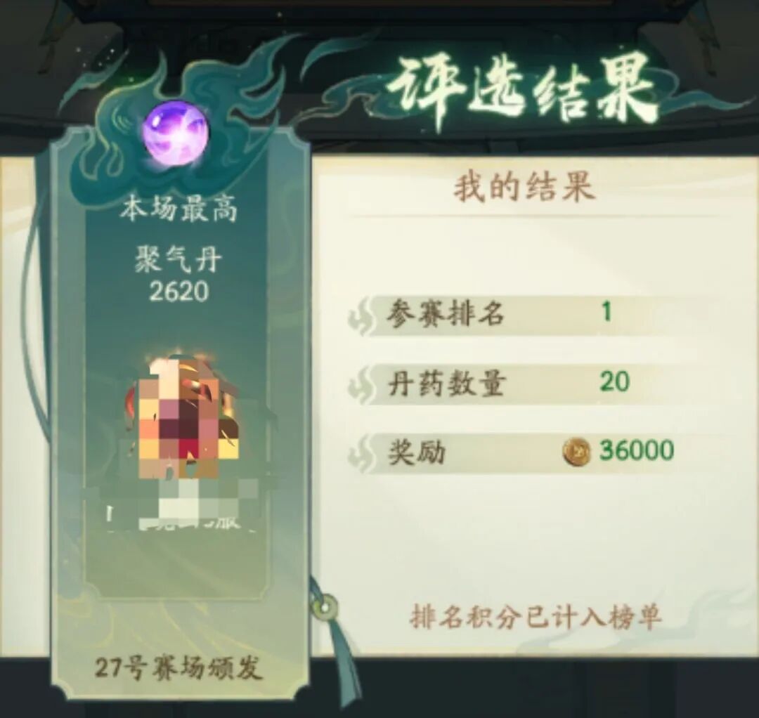 按照你的最高评分丹进行排名,按照你上阵的丹药数量进行结算积分,举例我上了10个丹我的最高丹获得了第一那我结算积分就是10*1800=18000分,20个丹就是36000分。
