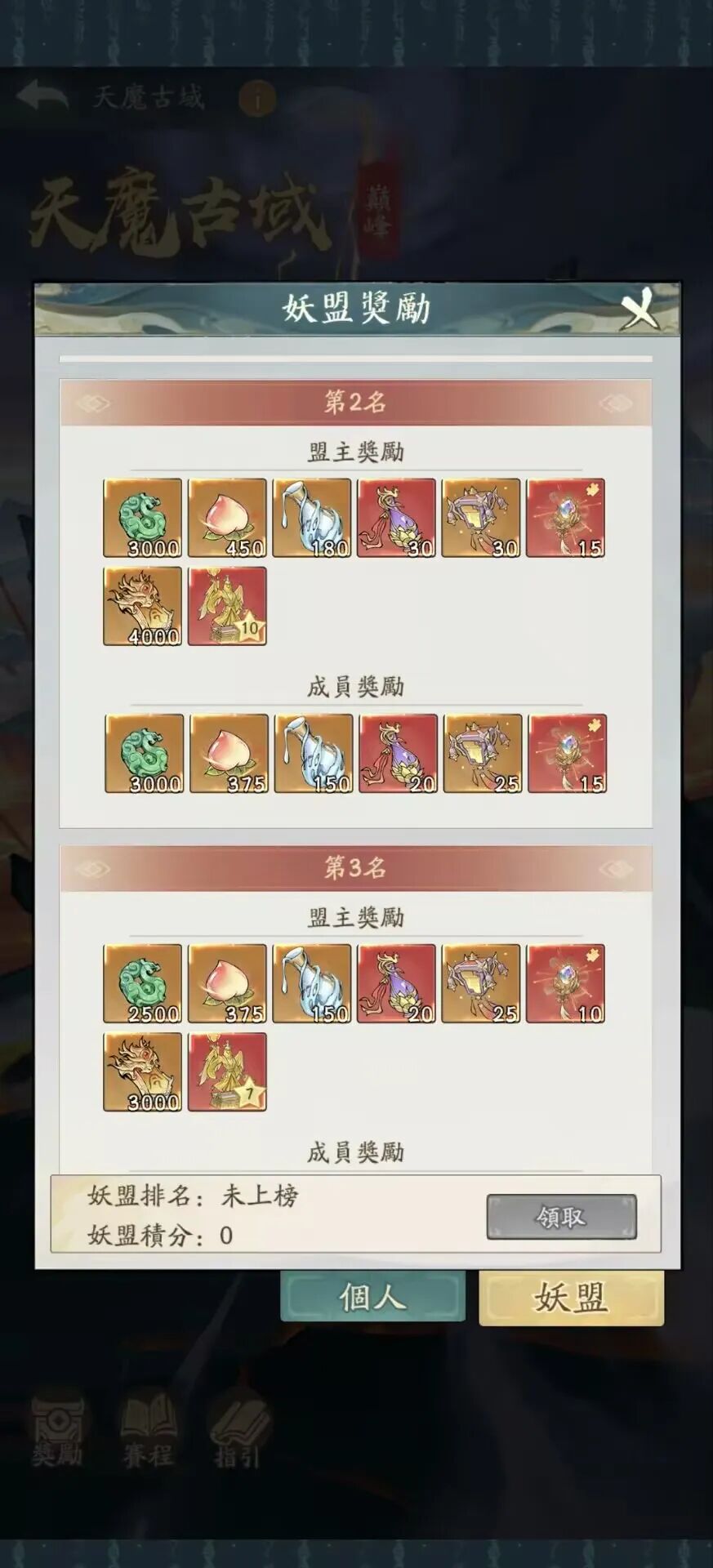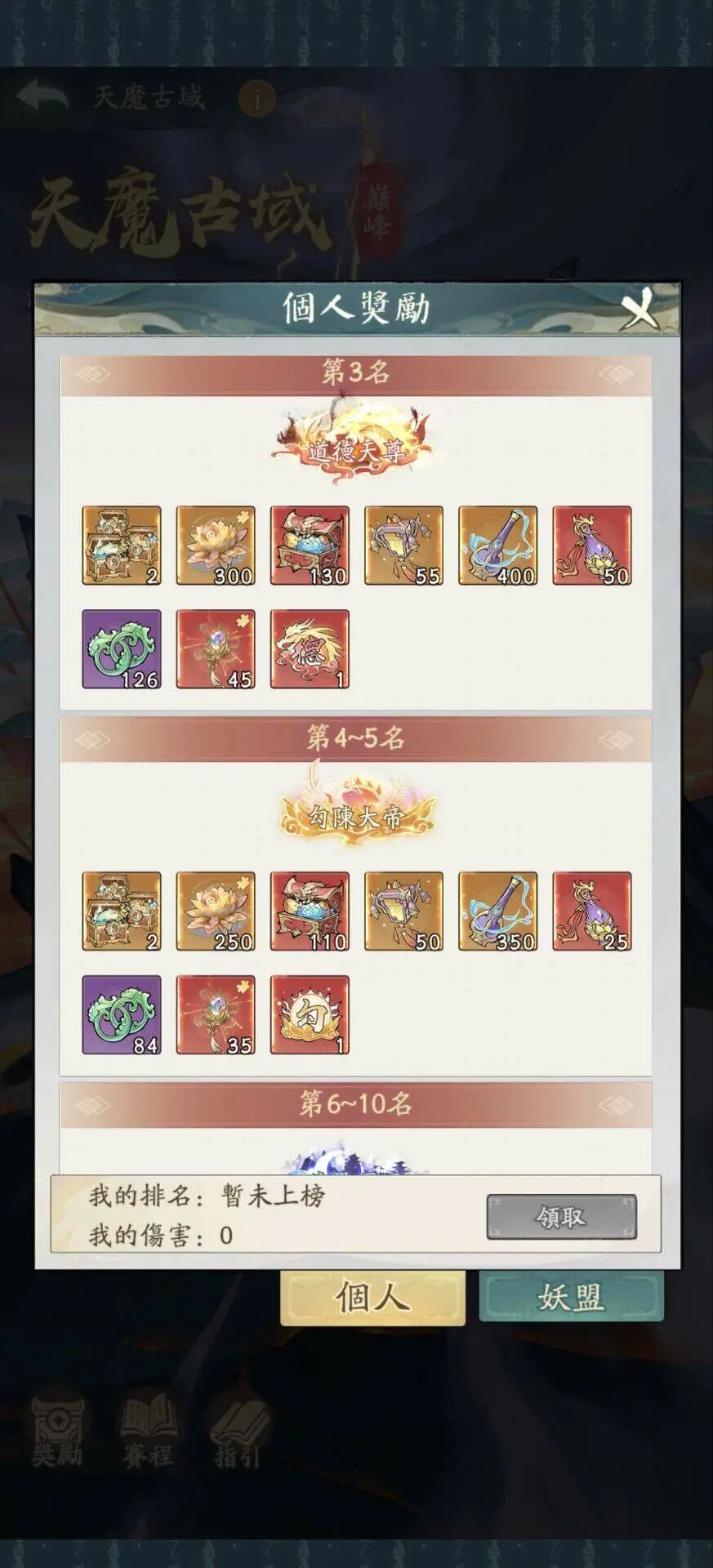 天魔古域分成3层,每一轮比赛组内积分靠前的妖盟下一轮将晋级更高层,中间的妖盟保持在此层,排名靠后的妖盟掉落至下一层。