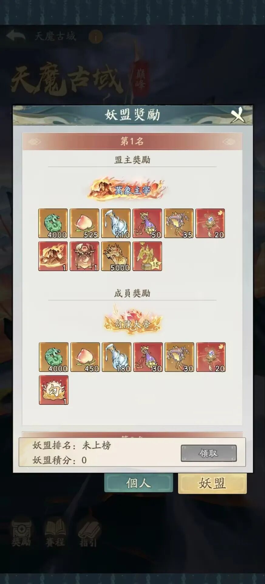 妖盟排行:活动结束后,根据每个妖盟在不同轮次获得的排行分之和进行排名,分数相同时根据妖盟的妖力高低进行排序。