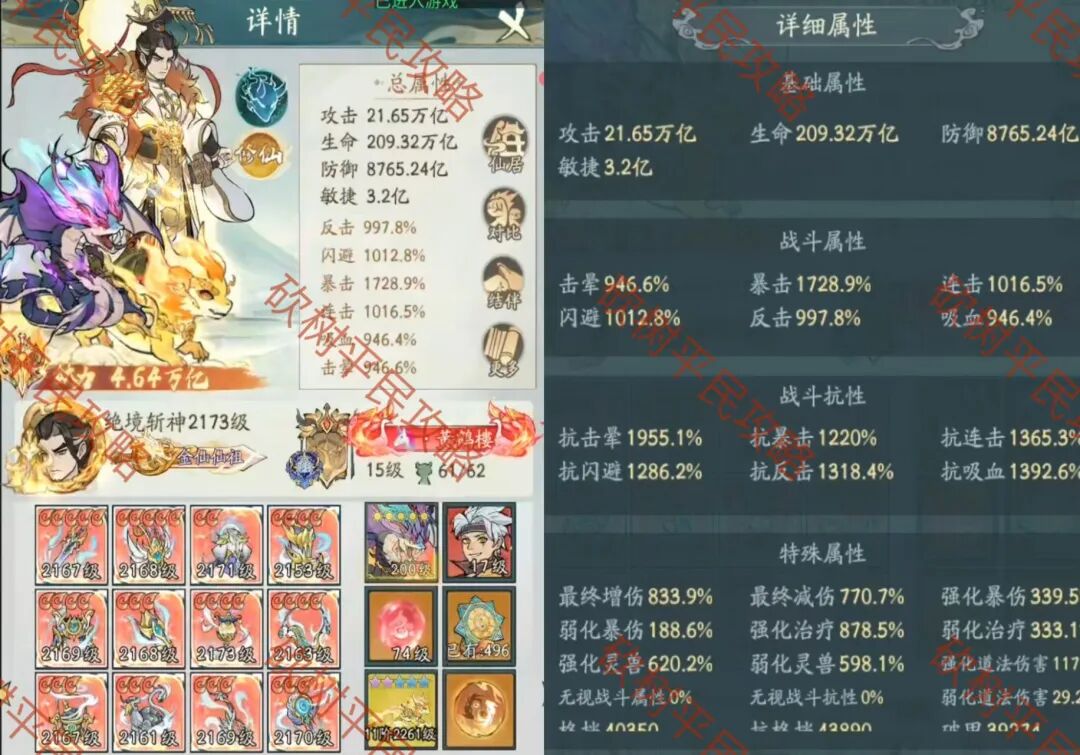 2️⃣ 增减介绍:2173级(仙尊前期),战力已经来到了4.64万亿!增减也是800+左右,也是一个主强疗的氪佬!目前500多区还没开仙君,不过在金仙境界。也是很容易拿到各种第一!