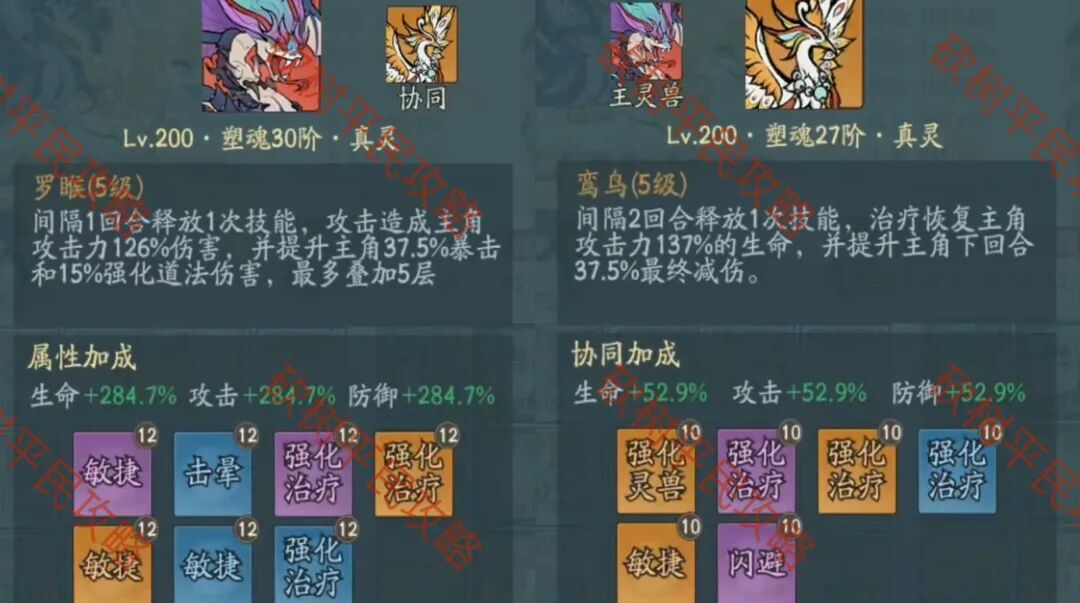1️⃣ 灵兽介绍:罗睺塑魂30阶➕鸾鸟塑魂27阶!这个塑魂等级还是比较高的!可以看到灵兽目前还不够完美。主敏捷以及强疗,如果罗睺击晕换金弱灵就完美了!鸾鸟技能则更差一些,差两个敏捷!