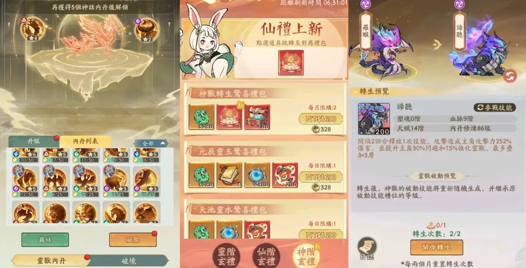 2️⃣ 灵兽转生与洪荒内丹:洪荒内丹类似于造化法宝玩法,不过最低开启条件要5个红内丹。平民甚至连开页面都开不开,更别说还要氪金洪荒内丹了!