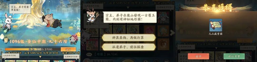 1️⃣ 获得藏宝图:每个人都可以通过与弟子对话,获得藏宝图!藏宝图品质不同获得的东西就不同!当然每天获取的藏宝图是有限制的,每2个小时就会有6个弟子禀报。应该有上限!推测大概在6-12个藏宝图左右!(常驻日常活动,没有时间限制)