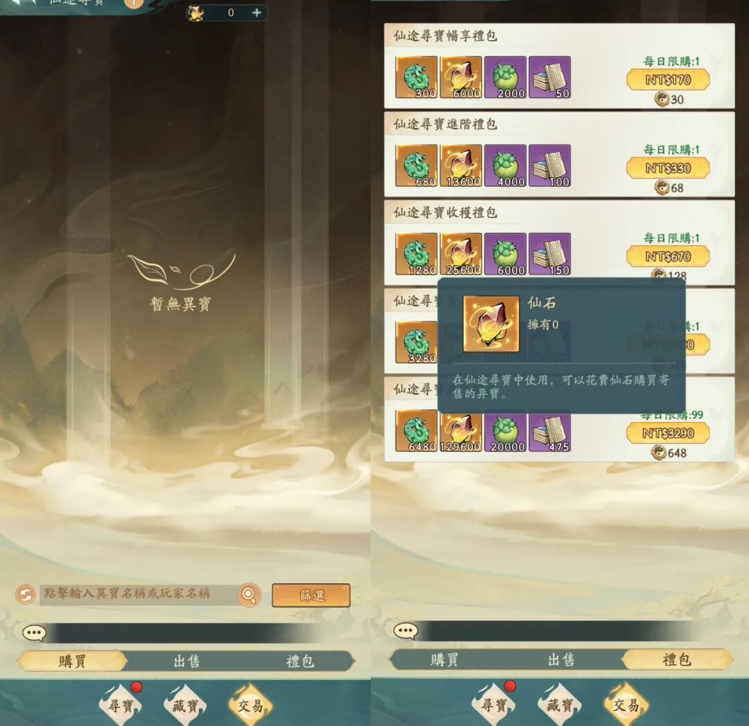 4️⃣ 装备交易:当装备达到了金色品质的时候,就可以在活动里面交易!交易装备等等,当然也是用的活动产出的仙石交易!仙石不够则可以氪金获取,感觉商人又有利可图了。就是不知道能不能私密交易!