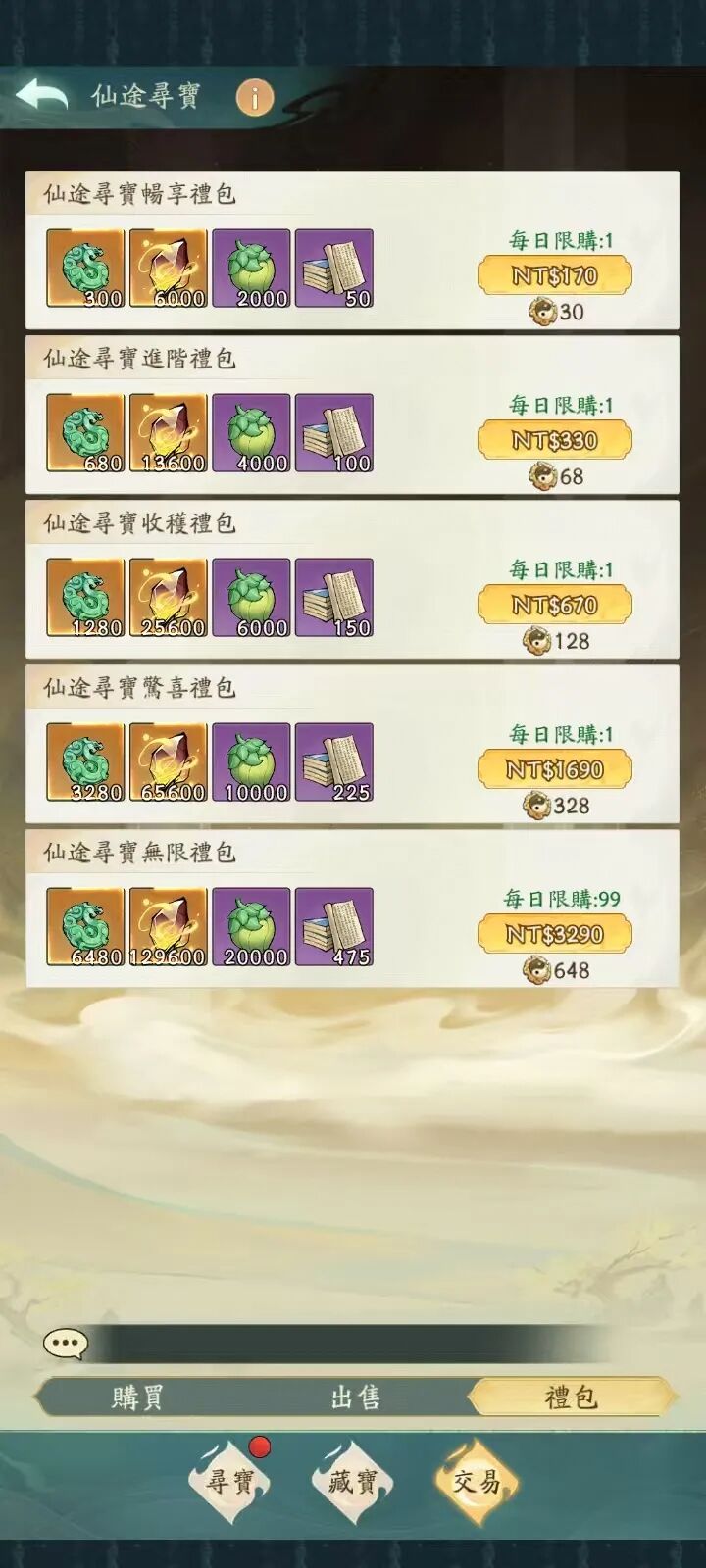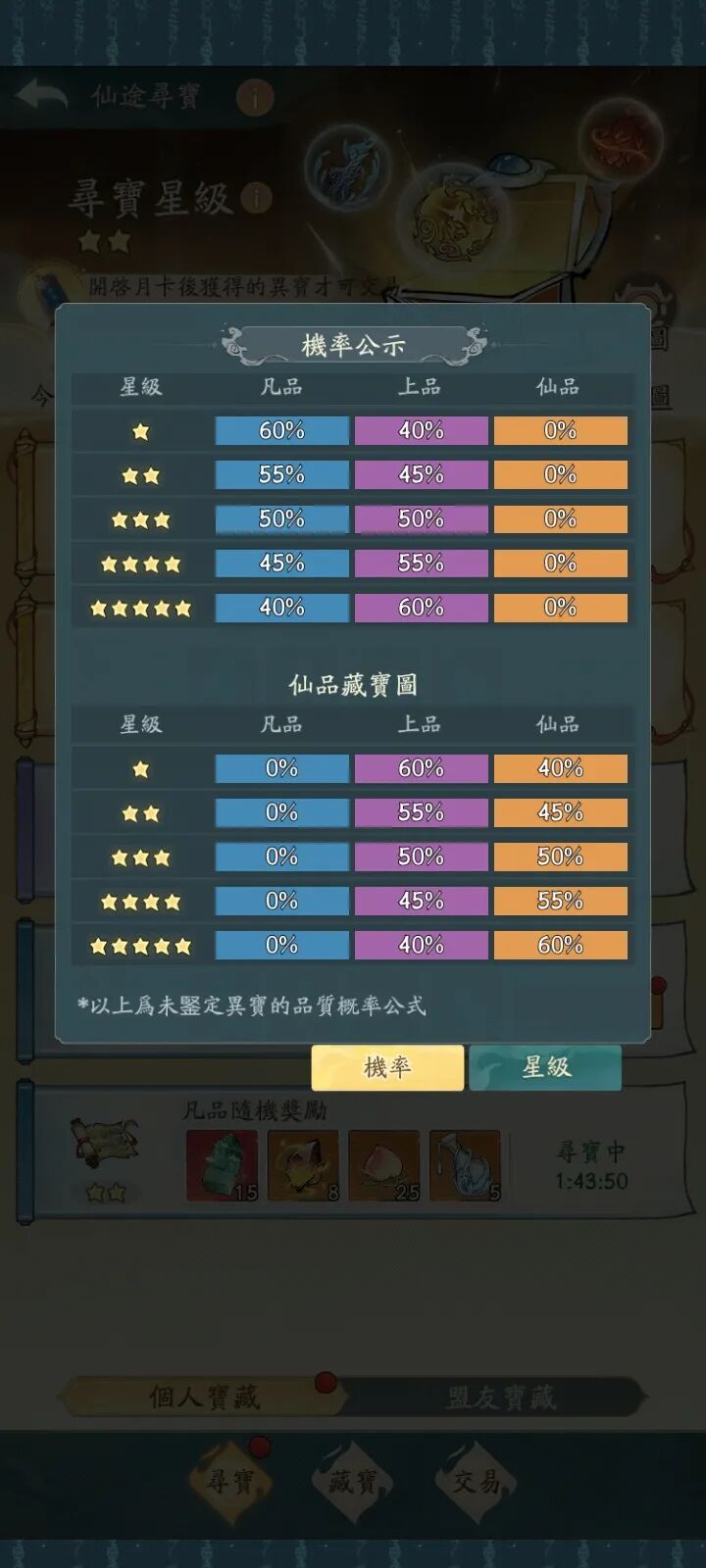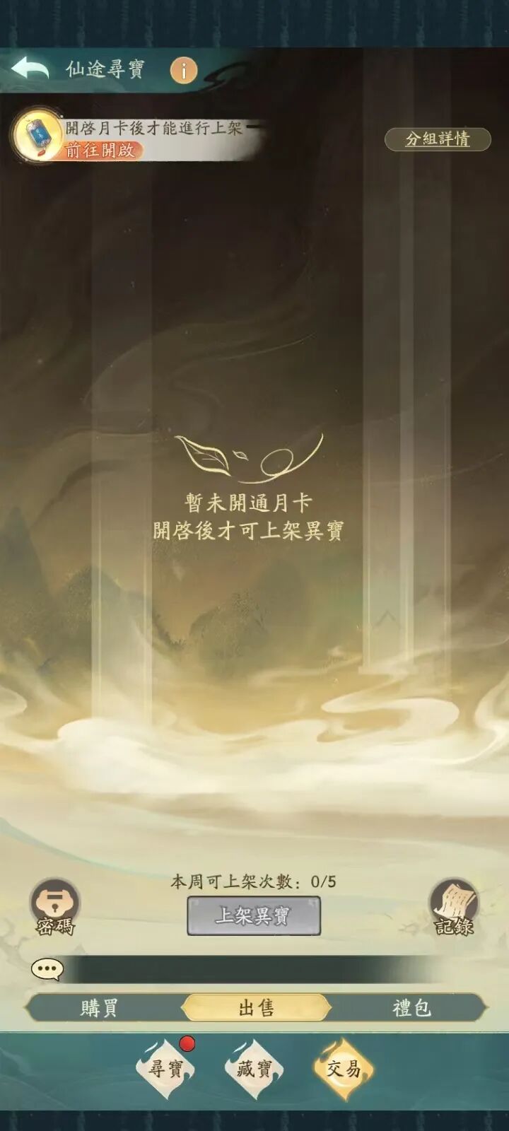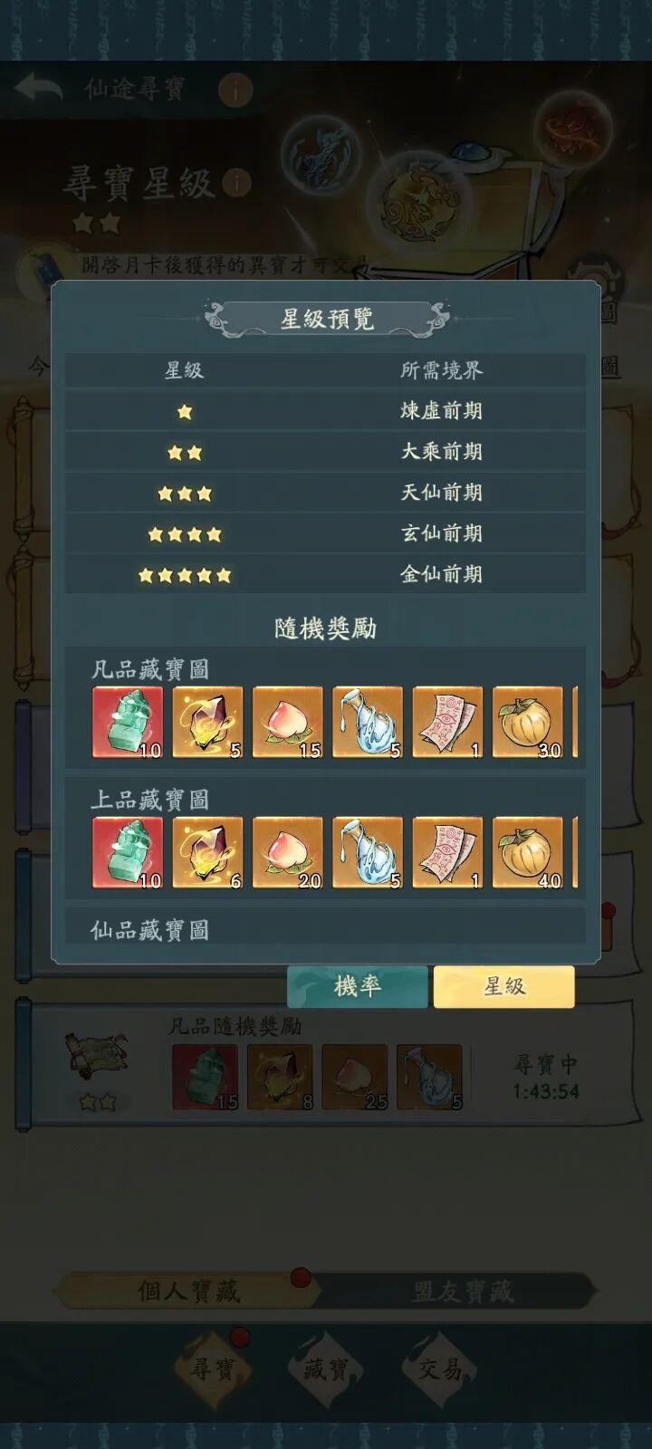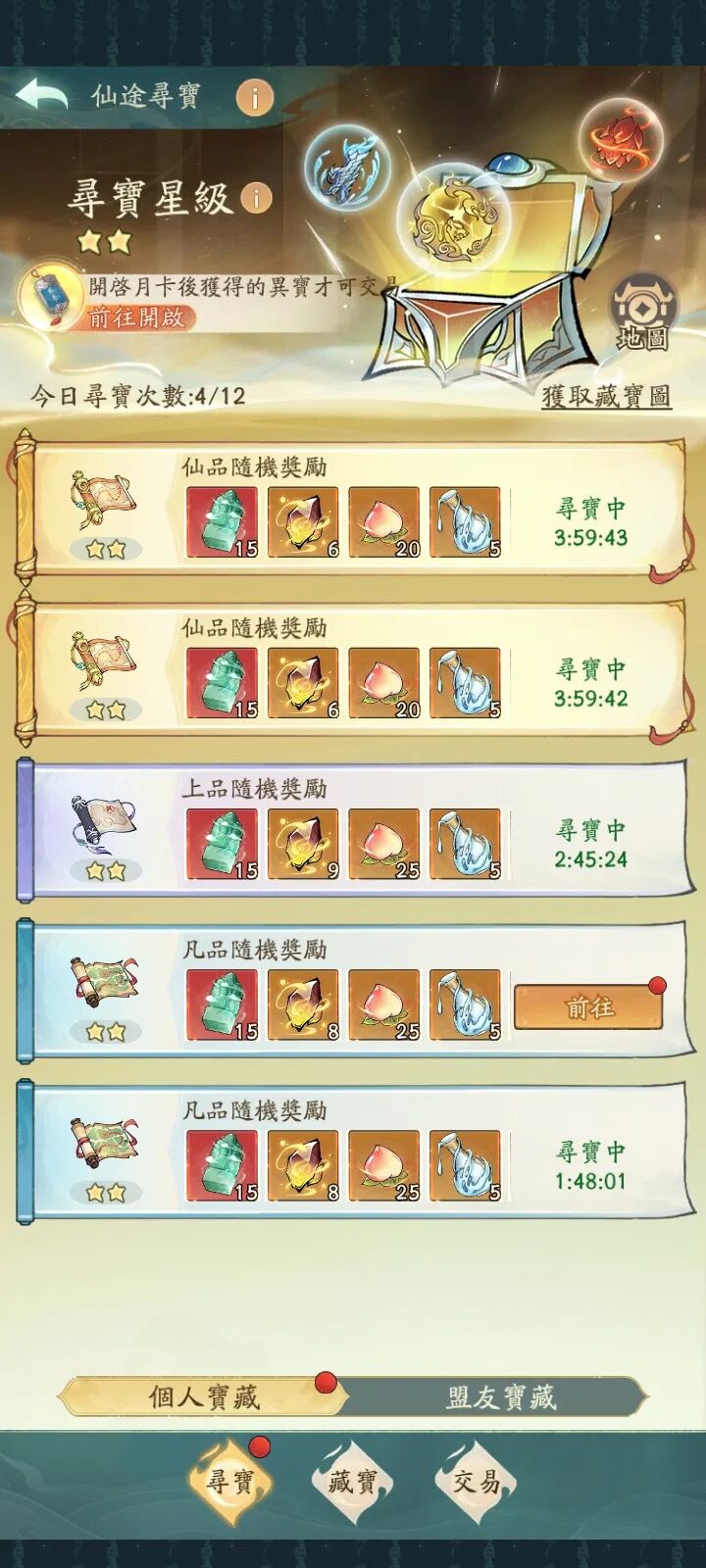 在每日福利的地方,会多出一个弟子人物,点击后会触发事件来获得图纸,这里算了一下,每天只能和弟子交流6次,2小时可以累计一次宗门事件,而且不是每次能获得图纸,也可能获得一些材料。 每个弟子回答一下问题就会随机获得一个图纸,这里没太注意回答的内容会不会影响获取,这个回头我再测一测。 我们到仙途寻宝的页面,就可以去分配挖宝了。这里需要注意,老样子,需要开月卡才能交易异宝。 图纸共有三个品种: 凡品:耗时2小时 上品:耗时3小时 仙品:耗时4小时 关键的来了,卡级玩家奖励会少!坏了,官方开始管控了,卡金仙以下的拿不到高星图纸,起码达到金仙前期此案呢个拿到最高5星。 异宝介绍 异宝有点像弟子试炼的玩法,挖到的异宝会和弟子一样有相关的基础属性加成,估计后面会有增减伤、弱疗等。 总共可以装配6件异宝,会和炼器大会那般进行评分,关键异宝可以交易!!! 异宝商店 我们可以看到商店的奖励包含了大部分比较重要的材料,因此仙途挖宝这个系统还是非常重要。 本文章内容来自:猪猪修仙阁