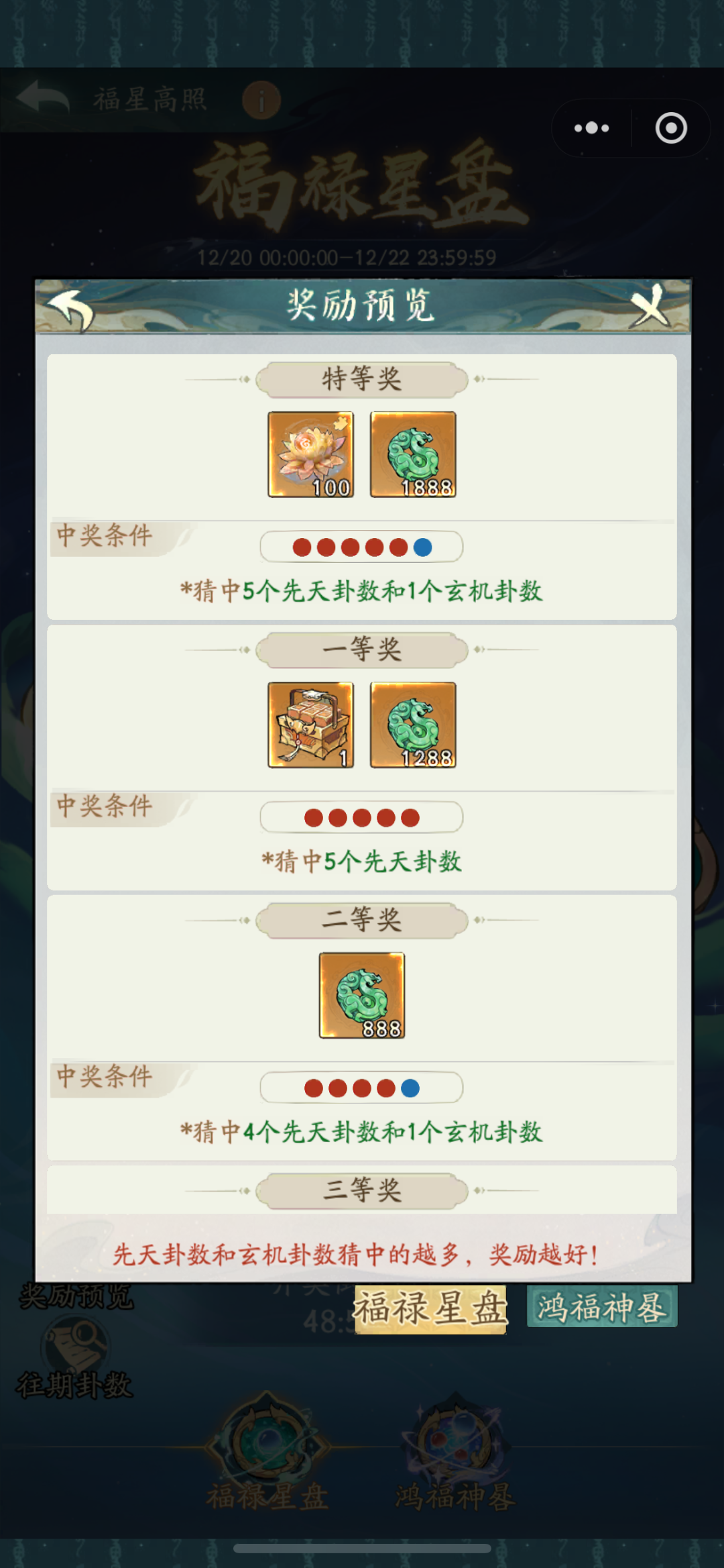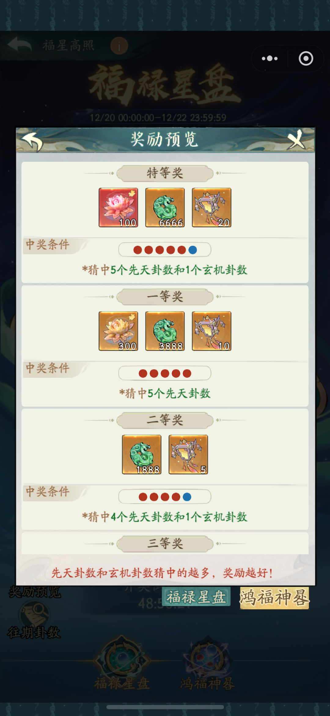•与福禄星盘规则一致,需从“先天卦数(选5个)+玄机卦数(选1个)”共6个数字组合成祈福卦数,开奖时按匹配数字数量判定奖励等级,匹配越多奖励越丰厚。