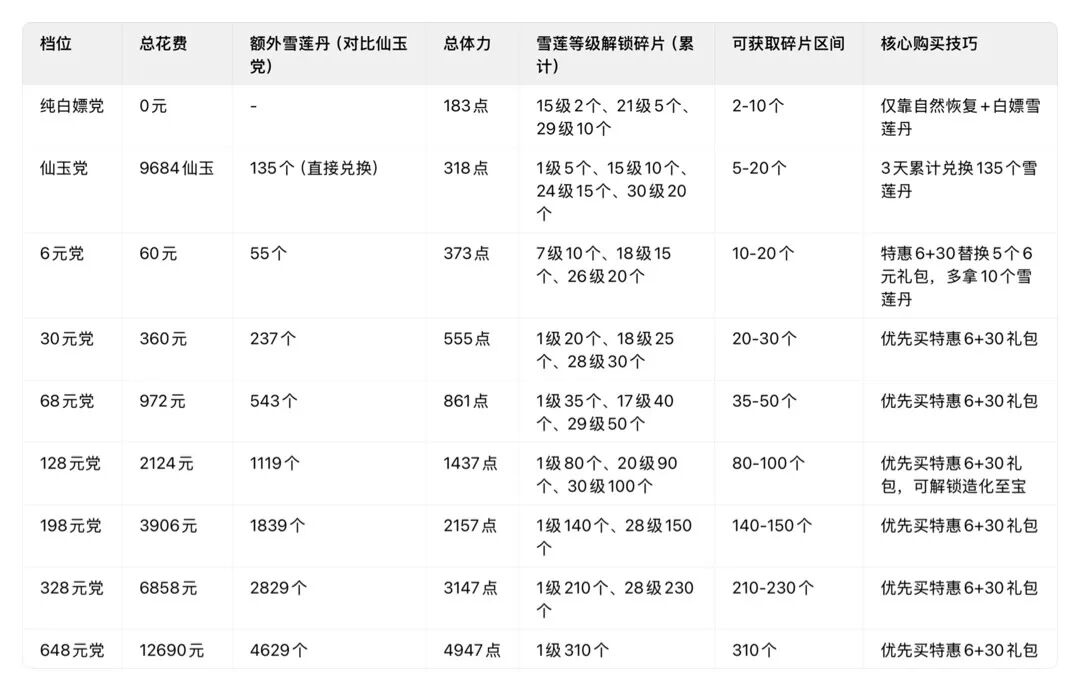 购买技巧:优先买特惠6,用特惠30替换5个6元礼包,比单独买6元礼包多10个雪莲丹