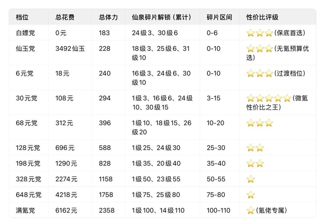 全档位氪金收益明细
