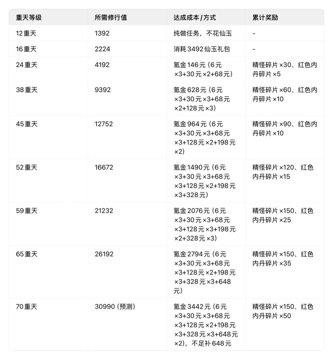 各重天等级所需修行值 达成成本/方式/累计奖励