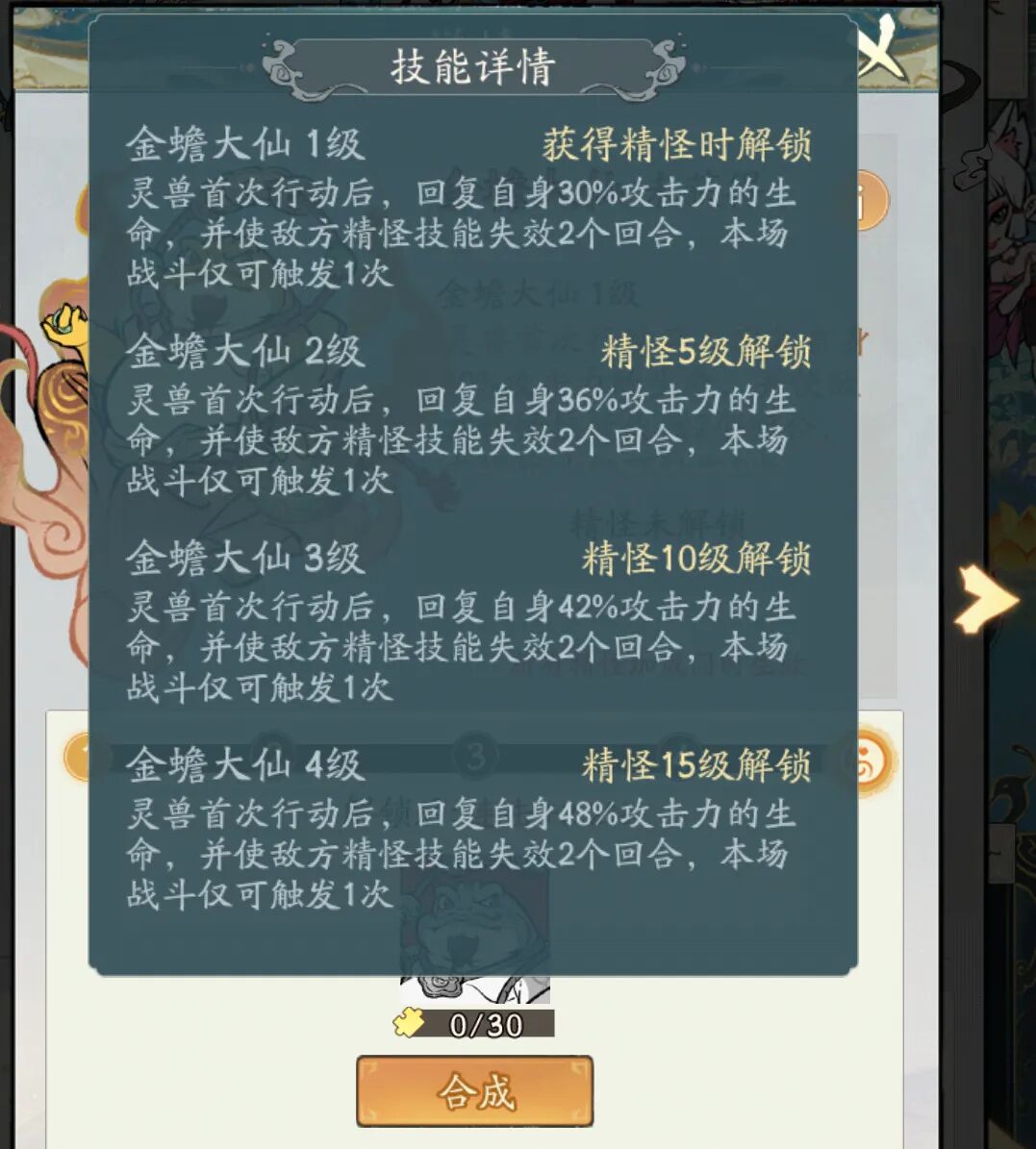 •触发节点:我方灵兽首次行动后立即生效(无需堆敏捷,出手顺序固定),回复自身30%攻击力生命(技能升级仅提升回血量),同时使敌方所有精怪技能失效2回合(含主动技能、回合触发技能,以“冻结”状态呈现)。