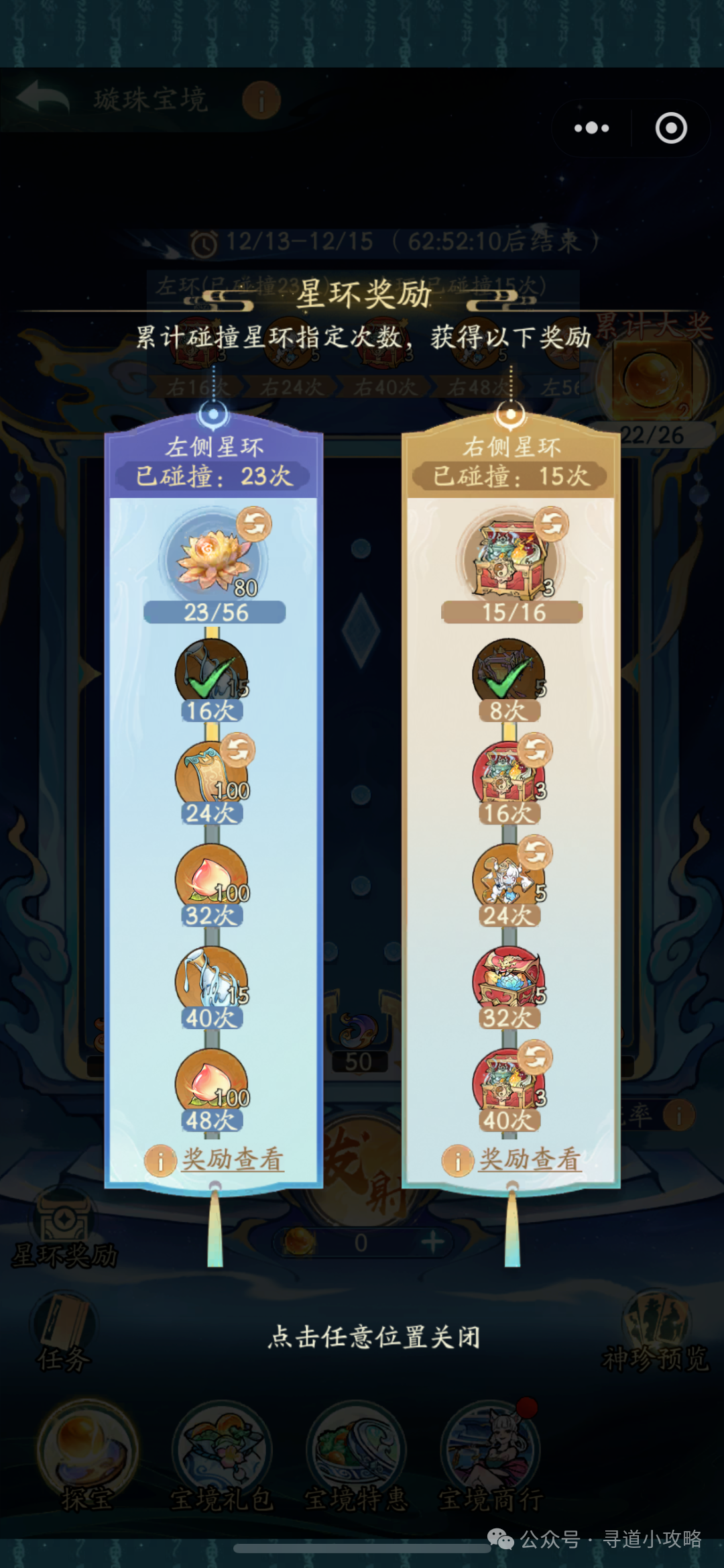 1.投掷与奖励:道友可使用「鸿运珠」,点击【发射】后珠子从任意出口弹出,根据最终落点获得「仙灵幻玉」和「玄灵幻玉」;珠子碰撞盘面左右两侧奖励勋章,累计碰撞次数达标可领珍稀奖励。