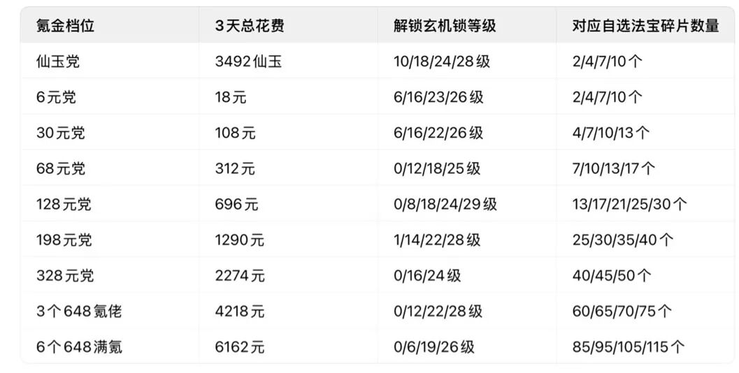 各氪金档位奖励明细(3天)