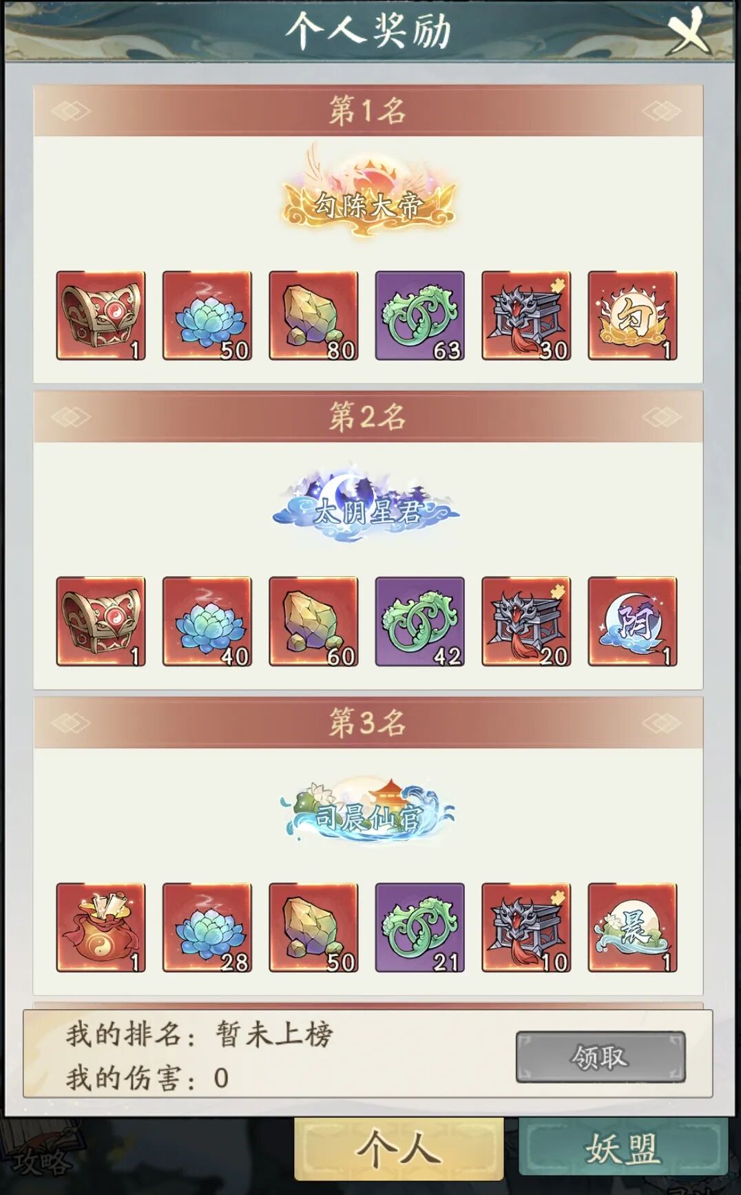 第一层/第二层 每日10:00准时上线 优先攻击星级最低的妖盟,抢守城人员人头,累积小额奖励 各分配10个令牌,集中火力快速拿分
