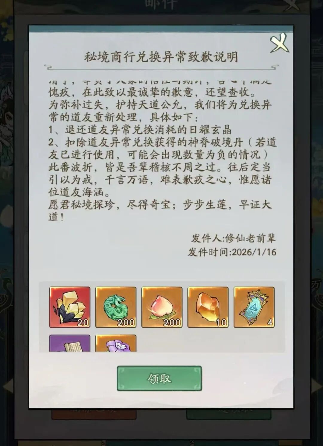 就在刚刚针对秘境探宝商店bug,官方给出了统一回复,补偿了玩家玄晶和道歉的邮件!