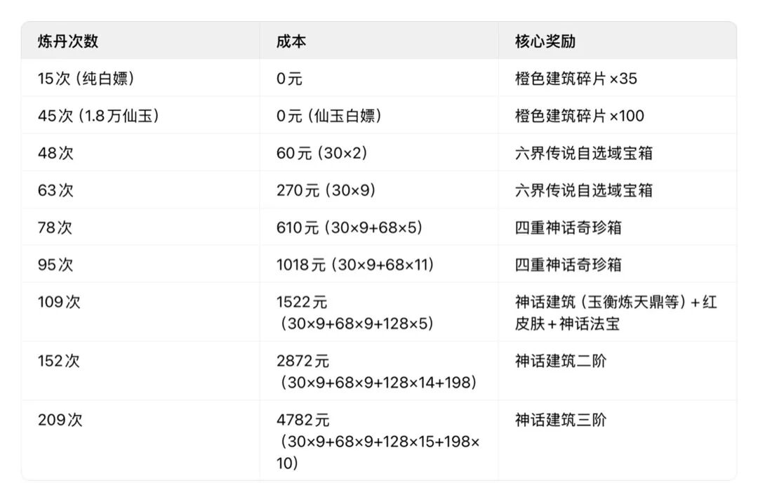优先选择109次炼丹档位(1522元),可直接拿下红皮肤+神话法宝+神话建筑。