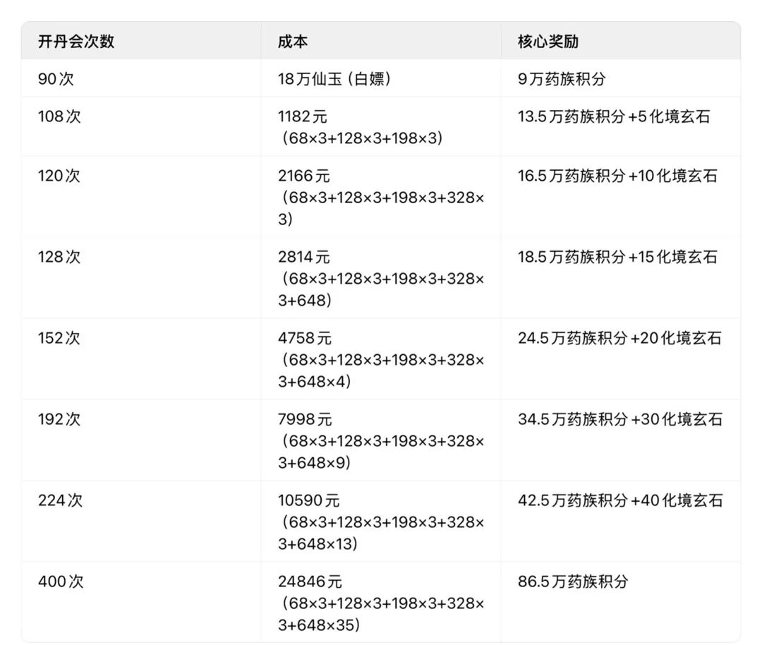 选择109次炼丹+108次开丹会,总花费约2700元,可获得红皮肤+神话法宝+5化境玄石+丹道盛典排行奖励。