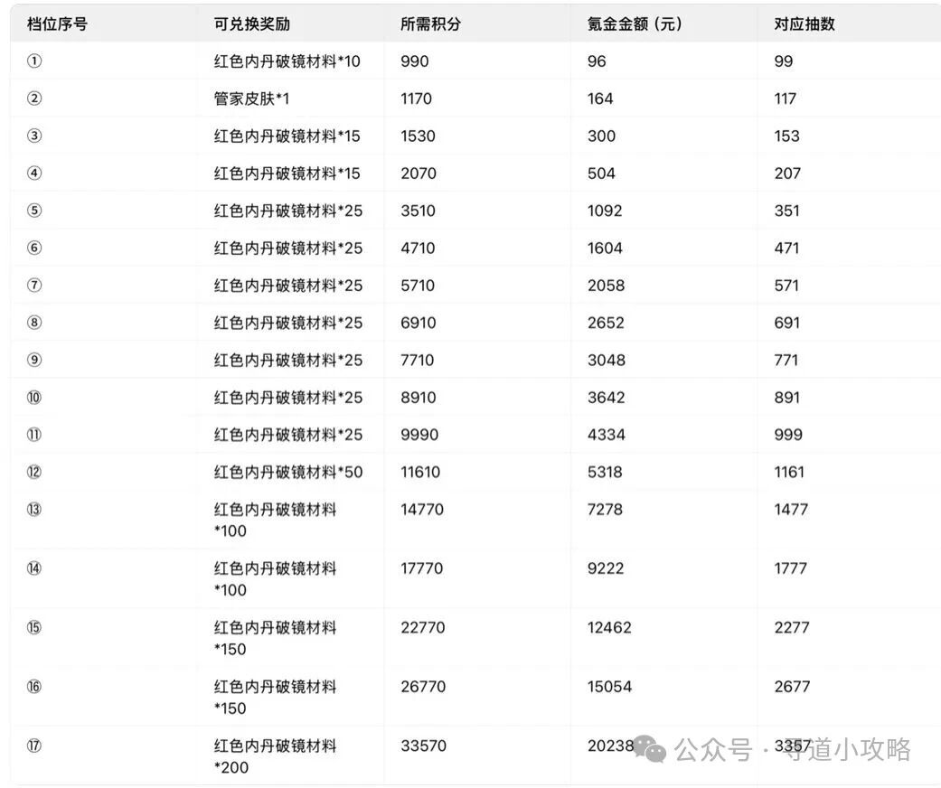 注:解锁兑换商店积分的氪金额度固定,珠子碰撞次数不固定,无法精准计算,以下为各档位的氪金与抽数、奖励对应参考: