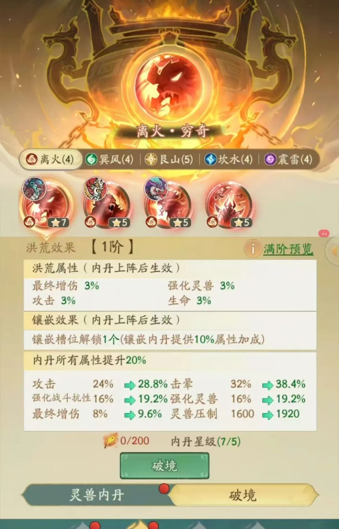 3.可兑道具:离火凤羽、巽风宝玉、艮山神石、冰火幽兰、震雷玄木等红色内丹破镜材料,还有管家皮肤、阁主霓裳、阁主内丹器等道具。