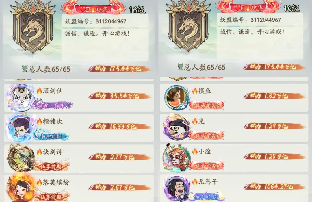 2️⃣ 最强妖盟:琼华妖盟175.44万亿战力!全服第一战力的顶氪酒剑仙大车头、以及超级大大氪的檀健次二车头!双核带队使得琼华在任何活动,单挑不虚任何妖盟。(特别是九幽等战力活动)1打多也几乎不会被推!